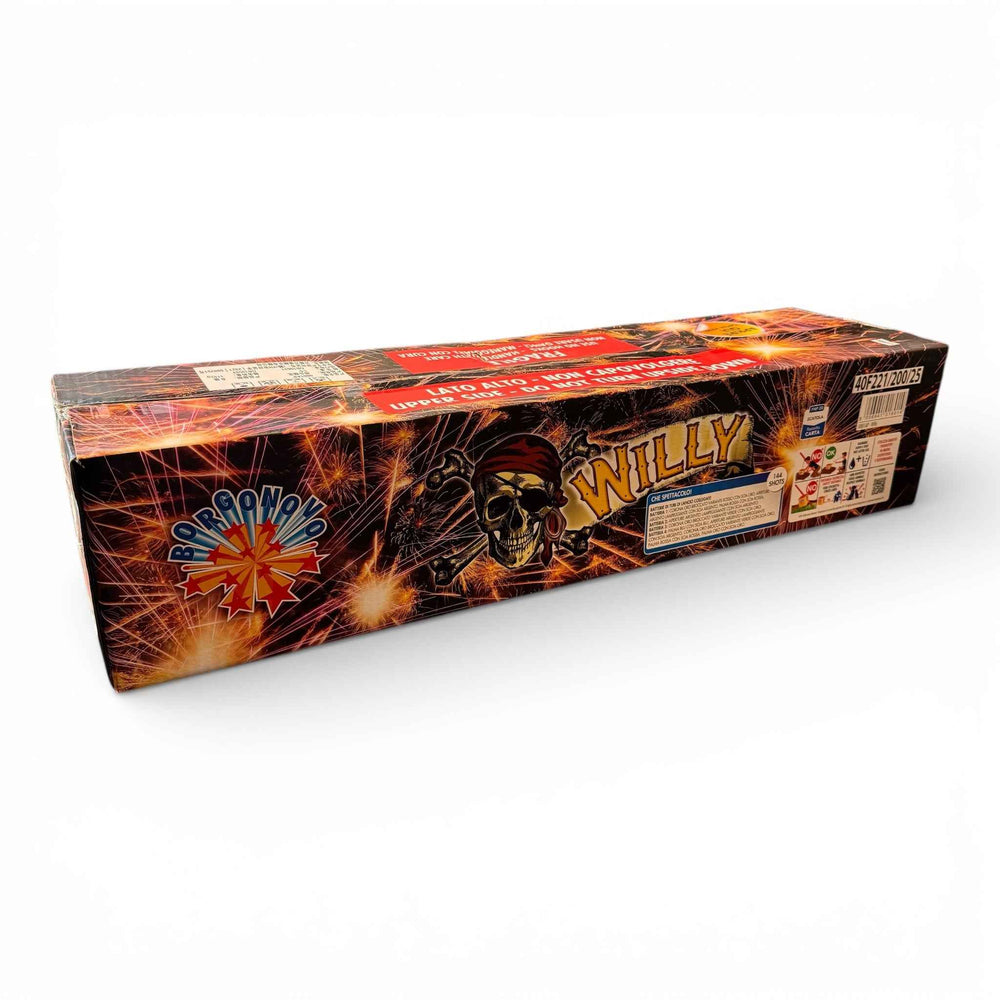 Batterie di tubi di lancio collegati. Effetto: Batteria 1: corona oro broccato variante rosso con scia oro, apertura argento lampeggiante con scia argento, palma rossa con scia rossa; Batteria 2: apertura argento lampeggiante con scia argento; Batteria 3: corona oro broccato variante verde con scia oro; Batteria 4: palma blu con scia blu, apertura argento lampeggiante con scia argento, corona oro broccato variante verde con scia oro, palma rossa con scia rossa, palma oro con scia oro. Numero colpi: 144; Cal. 22 mm.